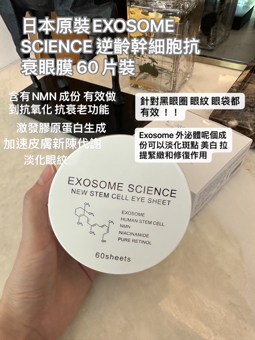 日本原裝EXOSOME SCIENCE 逆齡幹細胞抗衰老眼膜一盒60片 🔸優惠價:199 一盒 一盒有60 片可以用到30 日 好用分享推薦😎已經有好多客人回購 主要功能💥 💥針對黑眼圈 眼紋 眼袋都有效 ! ✨ Exosome 外泌體呢個成份可以淡化斑點 美白 拉提緊緻和修復作用 ✨含有NMN 成份 有效做到抗氧化 抗衰老功能 ✨激發膠原蛋白生成 恢復肌膚彈性 淡化皺紋 ✨高效保濕 易吸收 唔笠 舒服質地 ✨抗氧化 抗衰老功能 💥Exosome 外泌體呢個成份最近係美容院新寵😆效果令好多客人好滿意❣️😎另外,視黃醇和視黃醇棕櫚酸酯呢個成份有好好的抗氧化抗衰老功效,再加入咗NMN煙酰胺單核苷酸,水解透明質酸等,含有豐富既精華,高效保濕,令眼周皮膚光澤潤滑。另外,仲可以促進皮膚內膠原蛋白生成,保濕肌膚彈性,淡化眼紋,從基本改善皮膚底層,促進肌膚再生能力。