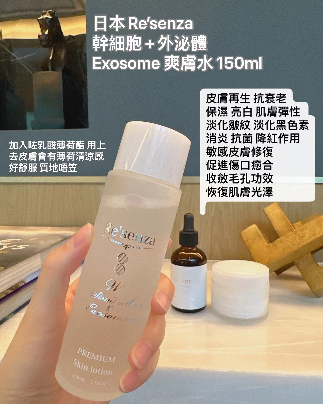 日本原裝Re’senza 幹細胞+外泌體Exosome 爽膚水150ml ♥️ 主打幹細胞同勁出名效果非常顯著嘅外泌體Exosome !! ✨主打抗衰老 刺激皮膚細胞再生和修復 效果很好!!吸收咗唔笠! 保濕度好夠,柔滑,膚色光澤 ✨用後皮膚會感到少少清涼感,係正常的,因為添加左乳酸薄荷酯,是乳酸薄荷酯是乳酸和薄荷的酯,是薄荷醇衍生物,具有清涼感😼 主要功效♥️ 🔸皮膚再生 抗衰老 抗氧化 卓越效果 🔸促進膠原蛋白產生 提升肌膚彈性 淡化皺紋 🔸皮膚修復 促進傷口癒合 淡化疤痕 印等黑色素 🔸 由內而外鎖水、亮白、還具有收斂毛孔 🔸調理因乾燥發癢的敏感肌膚 🔸 恢復肌膚光澤與彈性