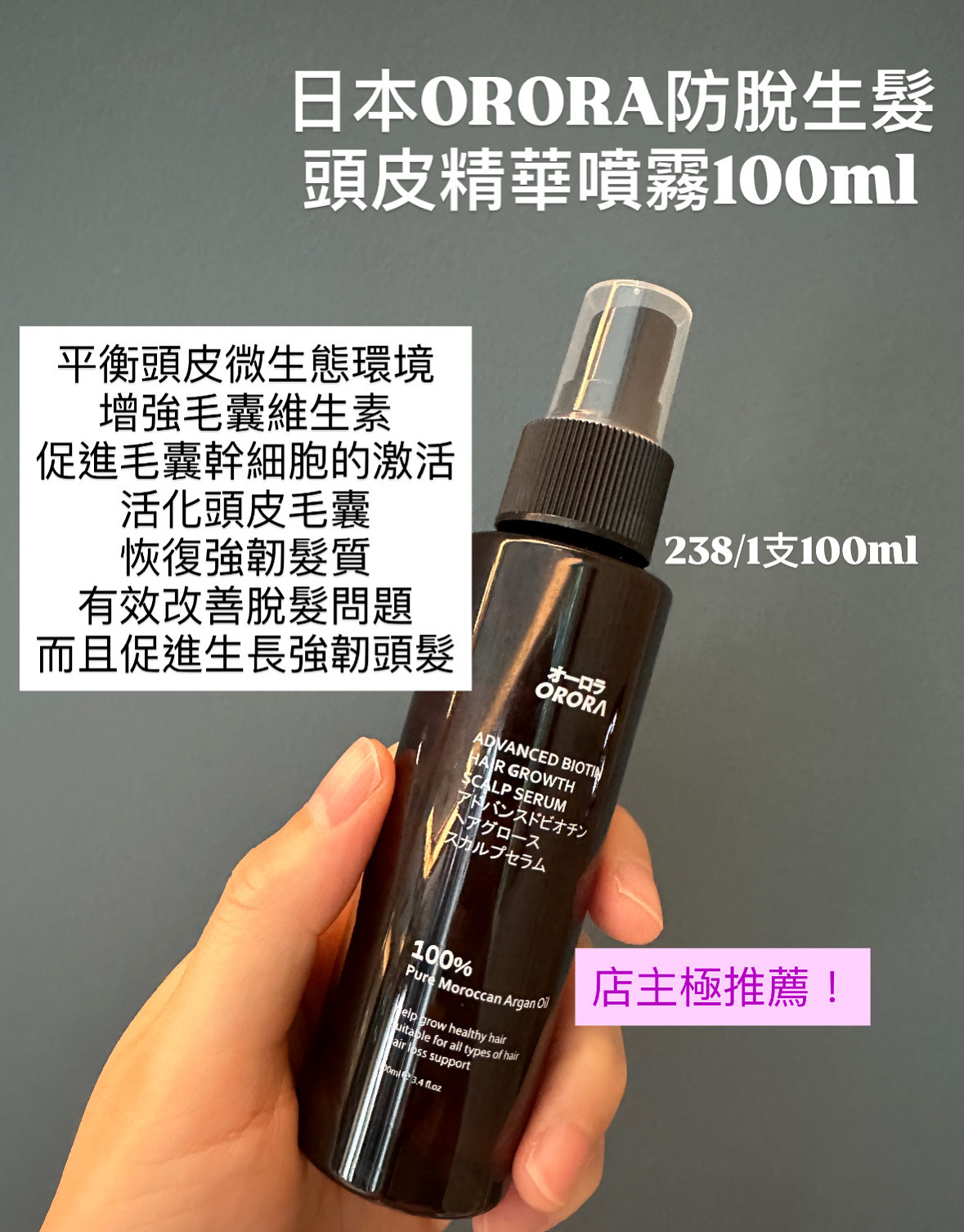 日本ORORA防脫生髪頭皮精華噴霧100ml 優惠推廣:238/1 支 (原價280) 平衡頭皮微生態環境 增強毛囊維生素 促進毛囊幹細胞的激活 活化頭皮毛囊 恢復強韌髮根 髪絲 有效改善脫髮問題 而且促進生長強韌頭髮 使用方法: 早上或晚上洗髮後 吹亁頭髮後均勻地噴係頭皮,配合指尖按摩,養分亦更容易深入頭皮同埋髮絲當中 主要成份 公植物乳桿菌萃取,公赤松葉萃取,摩洛哥堅果油