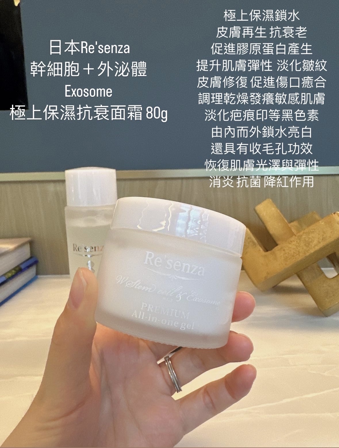 日本Re’senza 幹細胞+外泌體Exosome 極上保濕抗衰面霜 Re’senza 幹細胞+外泌體Exosome 極上保濕抗衰面霜,以日本尖端生物科技研發,融合珍貴幹細胞與外泌體精華,為肌膚開啟深層修復與再生之旅。這款面霜不僅能深度滋潤,更能有效淡化細紋、提升肌膚彈性,重塑肌膚年輕活力,讓您重拾自信光彩。 **重點功能:** 🔸深層保濕**富含玻尿酸、神經醯胺等高保濕成分,為肌膚提供深層滋潤,改善乾燥粗糙,重現水嫩細緻。 🔸高效抗衰**獨特幹細胞與外泌體精華,促進膠原蛋白再生,淡化細紋、提升肌膚緊實度,延緩肌膚老化。 🔸修復受損**修復受損肌膚,改善肌膚屏障功能,預防外界刺激,提升肌膚抵抗力。 🔸提亮膚色:**促進肌膚代謝,改善暗沉,提亮膚色,令肌膚透亮光澤。 🔸清爽不黏膩:**輕盈質地,易於吸收,不留黏膩感,舒適清爽。 **產品特色:** * 採用日本頂級原料,安全可靠。 * 無添加香料、色素、酒精等刺激成分。 * 適合所有膚質使用。 **使用方法:** 1. 清潔臉部後,於精華素後取適量面霜塗抹於臉部和頸部。 2. 輕輕按摩至完全吸收。 **建議搭配使用:** * Re’senza 幹細胞+外泌體Exosome 爽膚水 * Re’senza 幹細胞精華液 **Re’senza 幹細胞+外泌體Exosome 極上保濕抗衰面霜,助您重塑肌膚青春活力,展現自信光彩!**